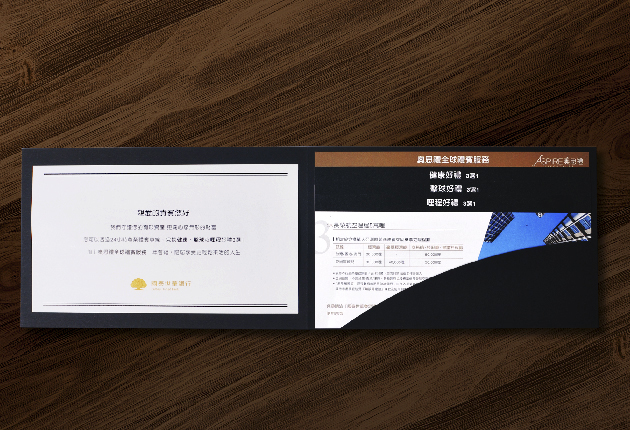 以俐落的infinity icon揭開序曲,緊扣無限的概念,說明國泰世華未來一年將給予頂級客戶的非凡禮遇,包含奧思禮、健檢、高爾夫、哩程等。排版上簡單大器,印刷上使用馬蒂斯紙,燙黑、局部亮等加工,讓客戶更感受尊榮。