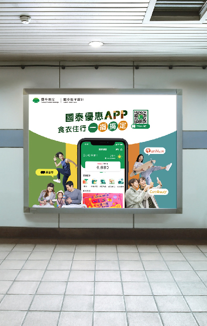 整合國泰集團的食衣住行於此APP,根據不同合作對象以及優惠於每季推出燈箱廣告。透過活潑的人物以及鮮豔的顏色呼應此APP生活、有趣的服務,除此之外主副標也採用額外設計的字體,讓活動的主題更加突顯。