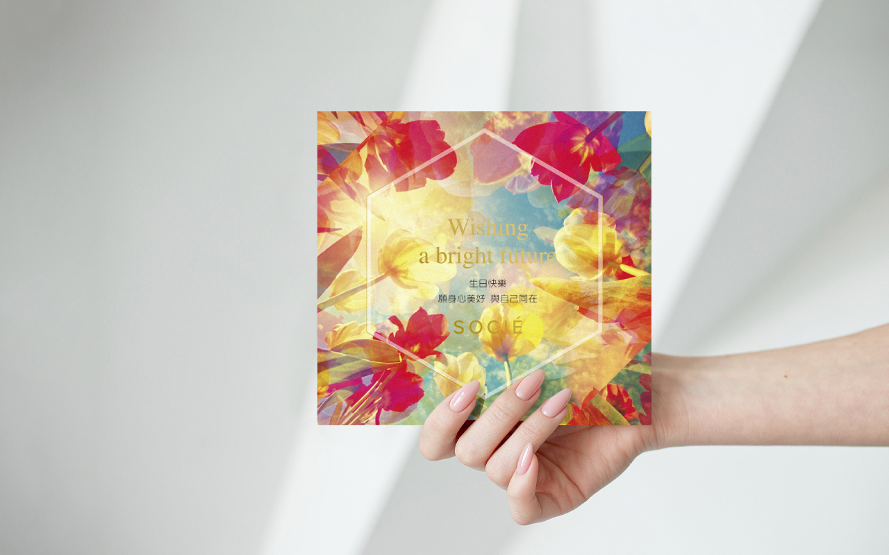 以綻放、多彩的花卉,帶有蜷川實花風格的畫面,是施舒雅希望與會員共同在現實世界中,看見的浪漫色彩。施舒雅期望每位顧客能基於自己原有的面貌、自信於自己獨一無二的特色,帶著這樣的自信,活出多采多姿的精彩人生。