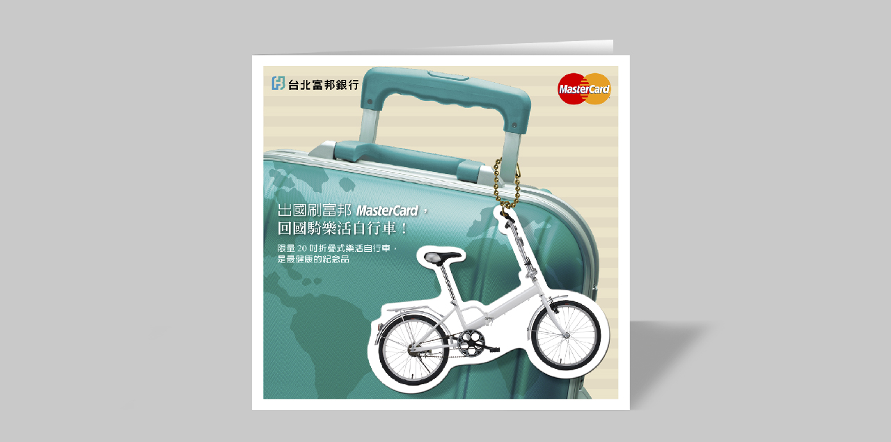 行李吊牌—樂活自行車,以高調吸睛的姿態聚焦畫面,誘人的贈品角色,提醒你旅遊刷富邦就能擁有。整體畫面同時以企業色系,強化視覺印象。