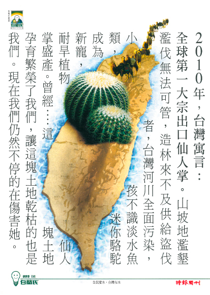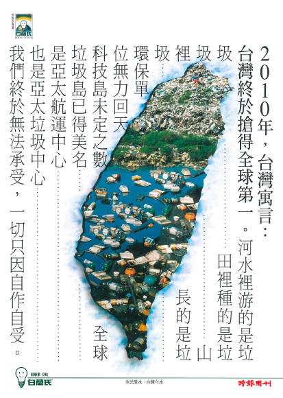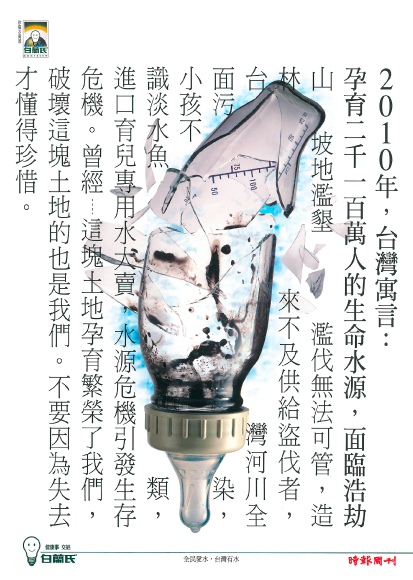 下:一系列寓言式的廣告,鼓勵舉手之勞就可省水,讓我們在還沒完全理解缺水嚴重性時,想像沒有水的日子,並以各種關聯事物,呈現在台灣土地中:如果不珍惜水:台灣將造成什麼困境。(時至今日,其一寓言已成真:水已比石油貴)