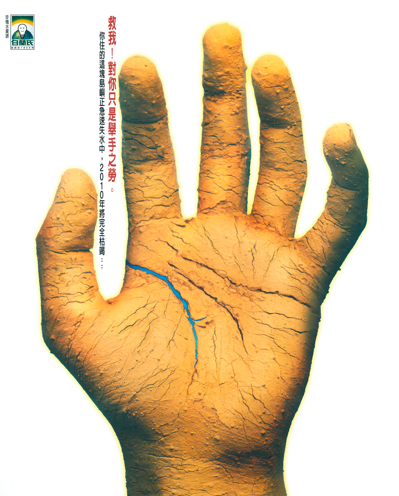 上:以一隻求救狀態的手,吸引注意,手紋轉換成即將乾涸的河流如川字,手心亦如龜裂的大地,奄奄一息向看到廣告的人求救,喚醒珍惜水資源的意識。