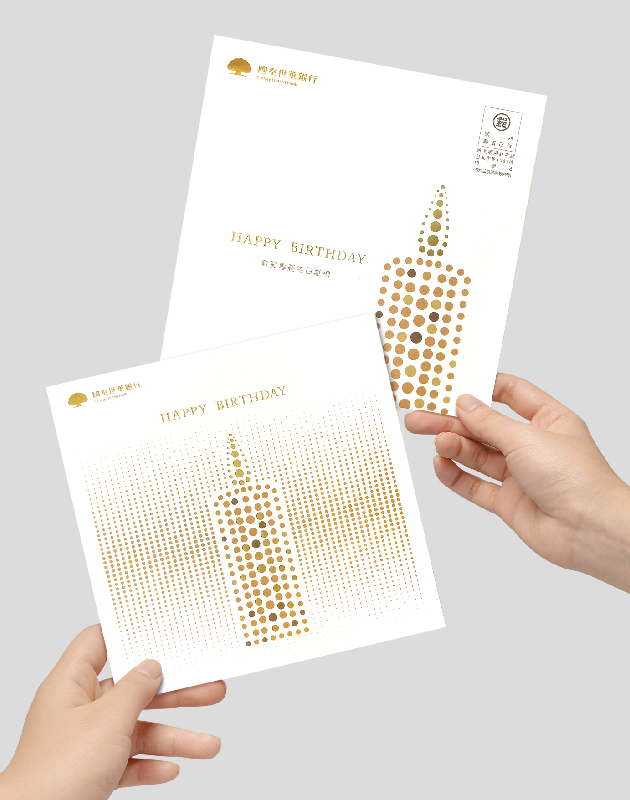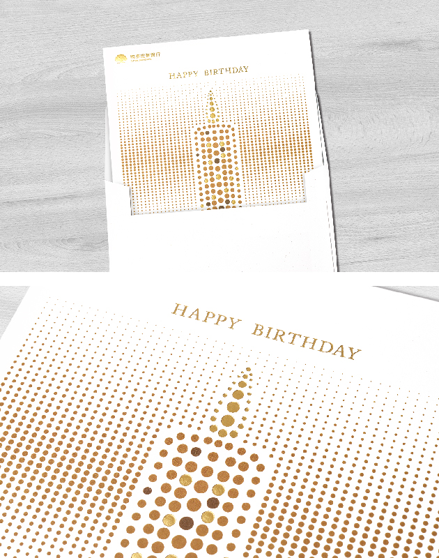 面對每一位財富管理貴賓的特別日子,以蠟燭為概念,創意簡約的視覺,背景大小錯落的圓,演繹了蠟燭點起時的閃爍,燙金則特別選擇帶有暖色調的金屬色,為High-end的對象,獻上最頂級、溫暖的生日祝福。