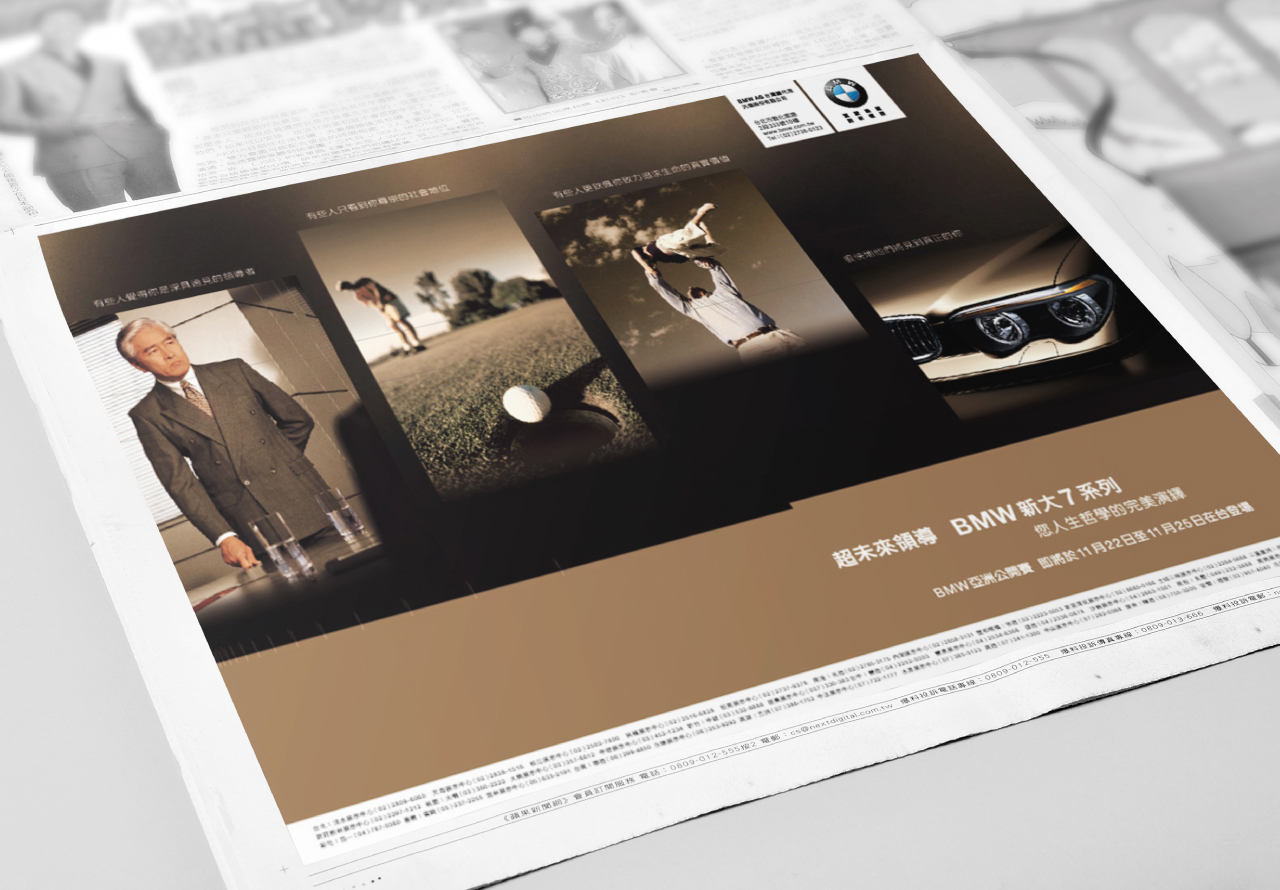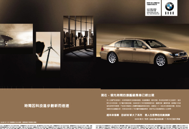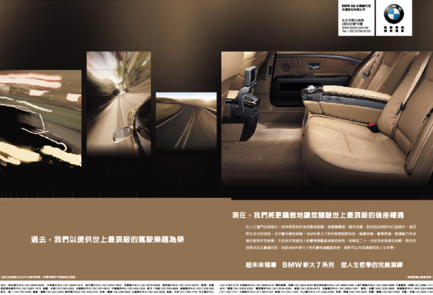 向來BMW多以駕馭者的頂級體驗為主訴求,新大7系列是為地位與人生達到成就的後座車主而上市。主軸:「超未來領導•您人生哲學的完繹」,道出目標對象的生活格局。並將產品力分別由科技、配備、後座舒適...切入,完整表現新大7系列的傲人之處:不疾不徐的自我超越,優雅雍容來往行程之間。