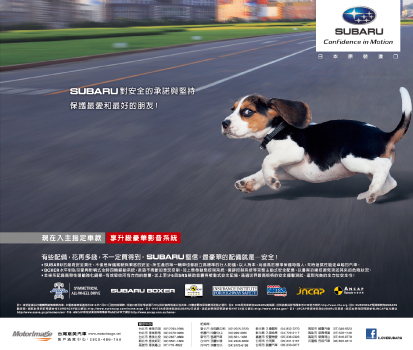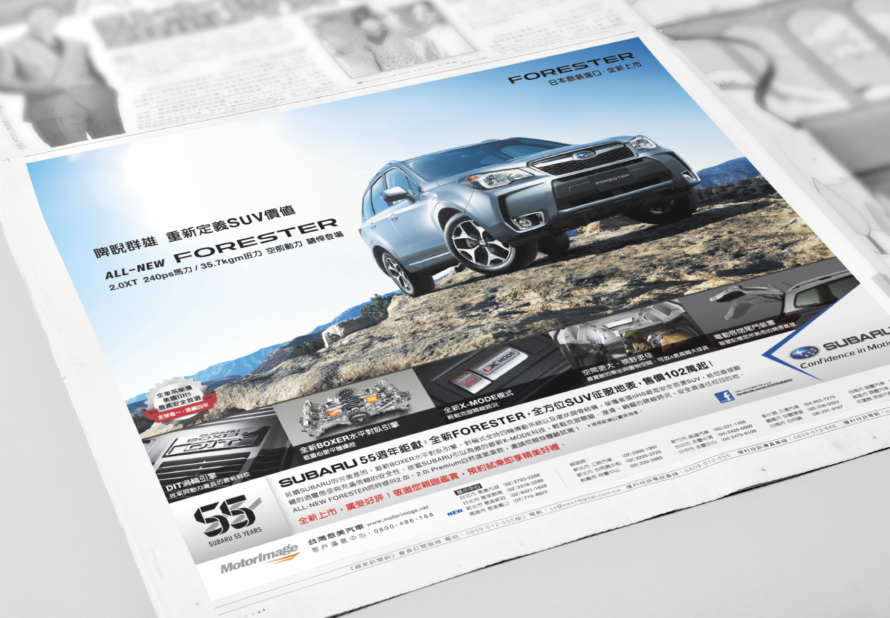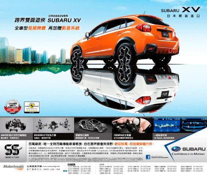 下左:SUBARU XV是一輛可以帶你到野外,也可以輕易穿梭擁擠都市的跨界休旅車,因此以水面倒影呈現2種明亮車色,各自迎向都市、山林的兩種空間,展現跨界玩味的樂趣。