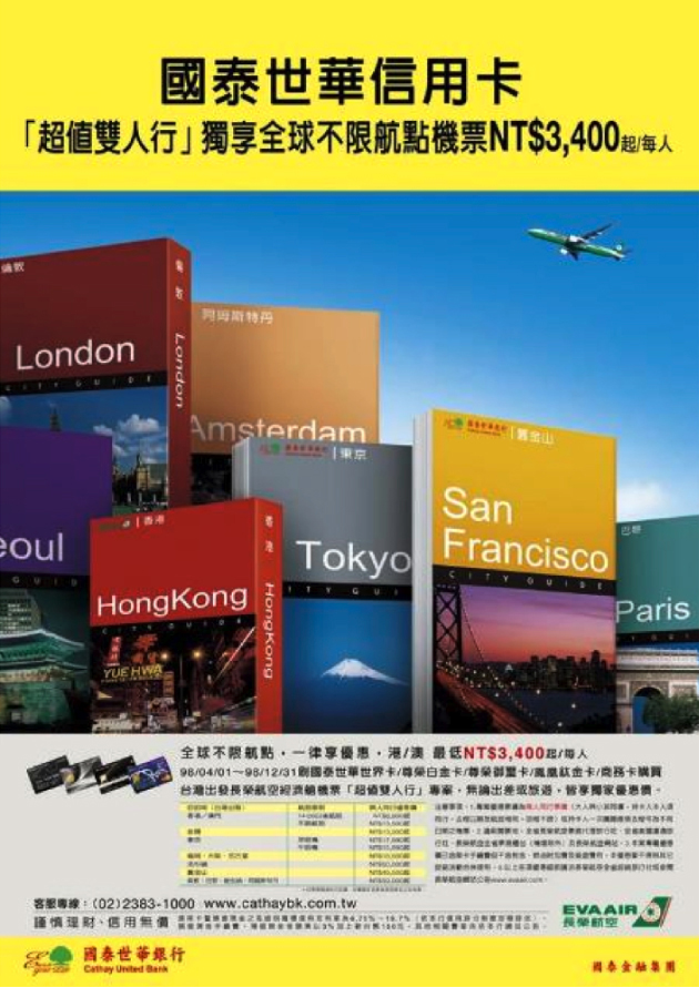 下右:出國玩,不只要翻閱旅遊書,帶哪張卡出國也很重要的。因此在機票優惠的信用卡促刷方案中,以知名的旅遊書樣式,呈現各大城市景點,不管去哪就是要帶國泰世華信用卡。"