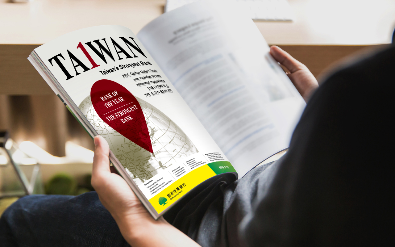 上:2014年國泰世華獲得2家深具影響力的雜誌肯定,獲頒銀行獎項殊榮,因此將國泰世華定義為台灣最強銀行,面對國際上的讀者,將TAIWAN的I改為1,象徵第一名,並在地球中以打卡標誌,標示出台灣,讓世界認識台灣。